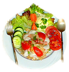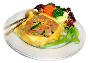 „PAT THAI“ Reisnudeln mit Garnelen und Sojakeimen „Pochana Art“ in Eihülle