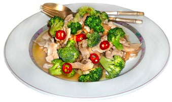 Hähnchenbrust, Schweine- ODER Rindfleisch mit Broccoli auf thailändischen Nudeln