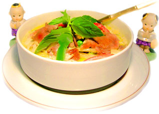 Beef Filet coconut milk green curry with bamboo, peas and paprika